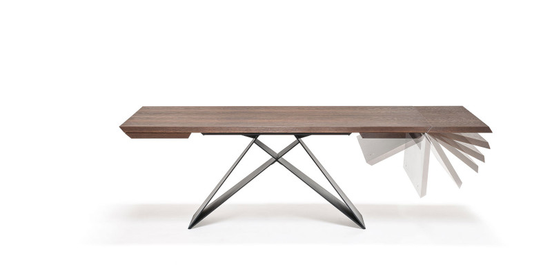 Választható tömör dió-, vagy tölgyfából készült meghosszabbítható asztallap. A lábak titán, grafit, vagy fekete lakkozott acél változatban kaphatók.