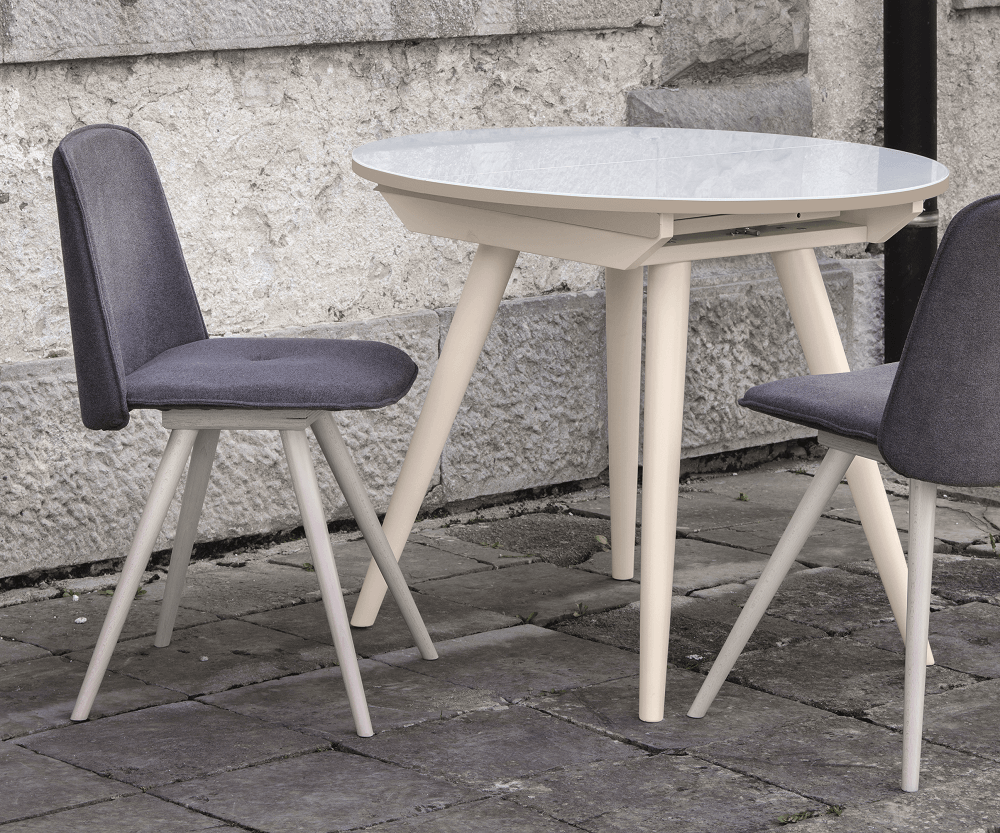 Nat. Aris kiterjeszthető olasz étkezőasztal. Kültéri és beltéri helyiségekben is egyaránt esztétikus és praktikus bútorzat például alkalmi étkezésekhez. A lábszerkezet és a kiterjesztések bükkfából, míg az asztallap központi része áttetsző, vagy füstös üvegből készül.