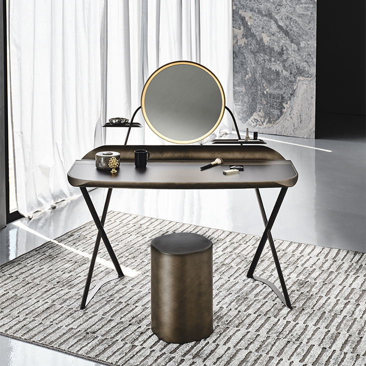 Cat. Cocoon Trousse Leather fésülködőasztal LED világítással. Az asztallap dekoratív, választható típusú és színű bőrborítással készül. A láb és tartószerkezet titán, bronz, vagy fekete lakkozott acél.