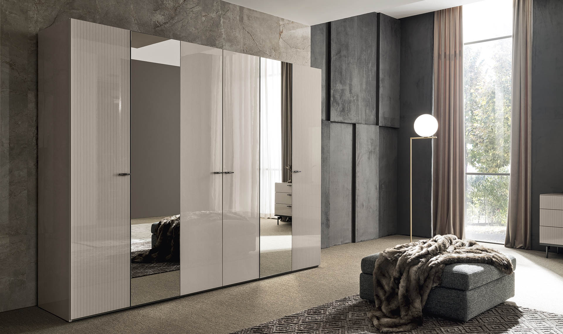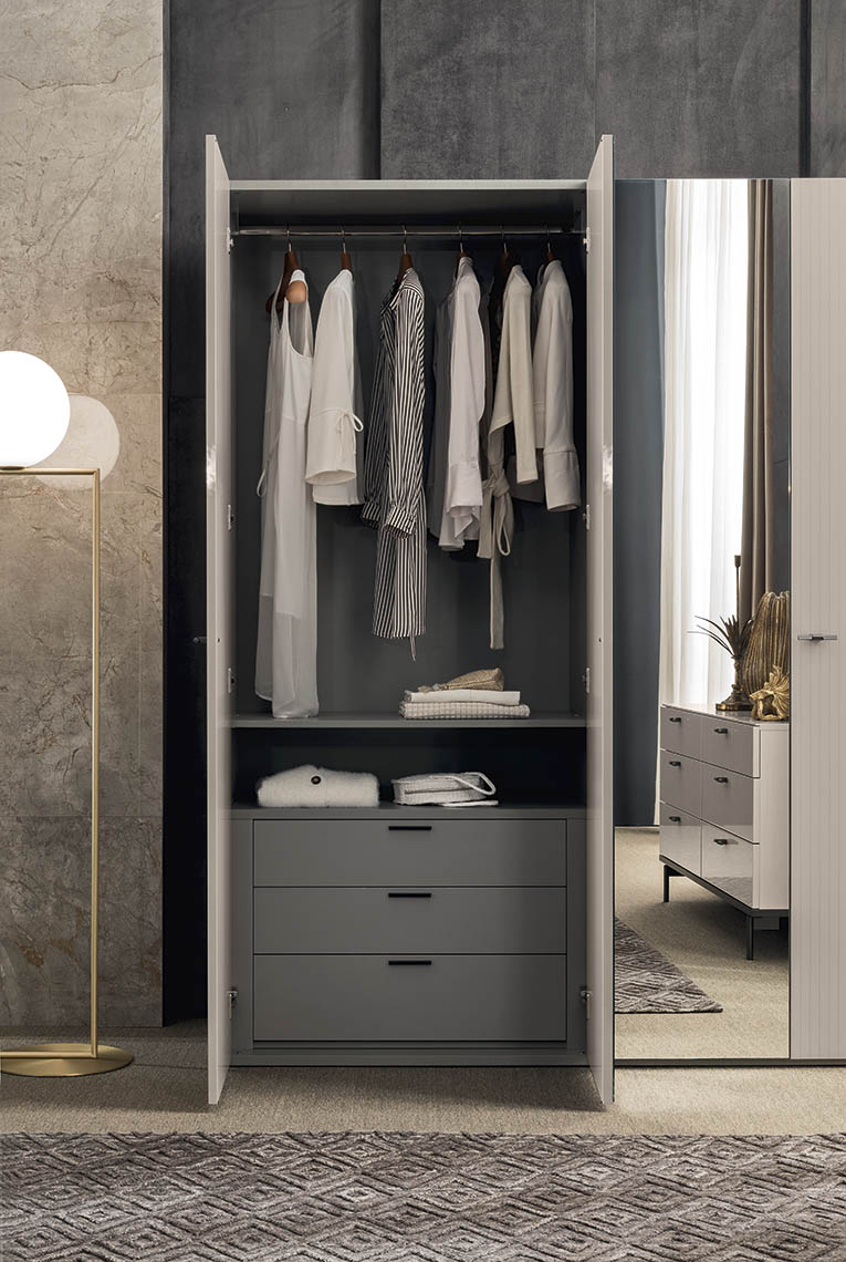 AL. Claire olasz dizájn gardróbszekrény különböző összeállításokban modern letisztult vonalakkal. Hatalmas belső terek és elegáns fénylő felületek kompozíciójaként áll össze a Claire kollekció hálószobákba szánt egyik legmeghatározóbb bútordarabja.