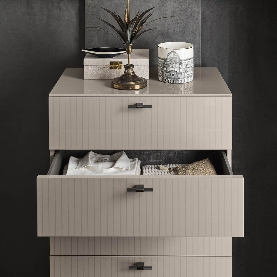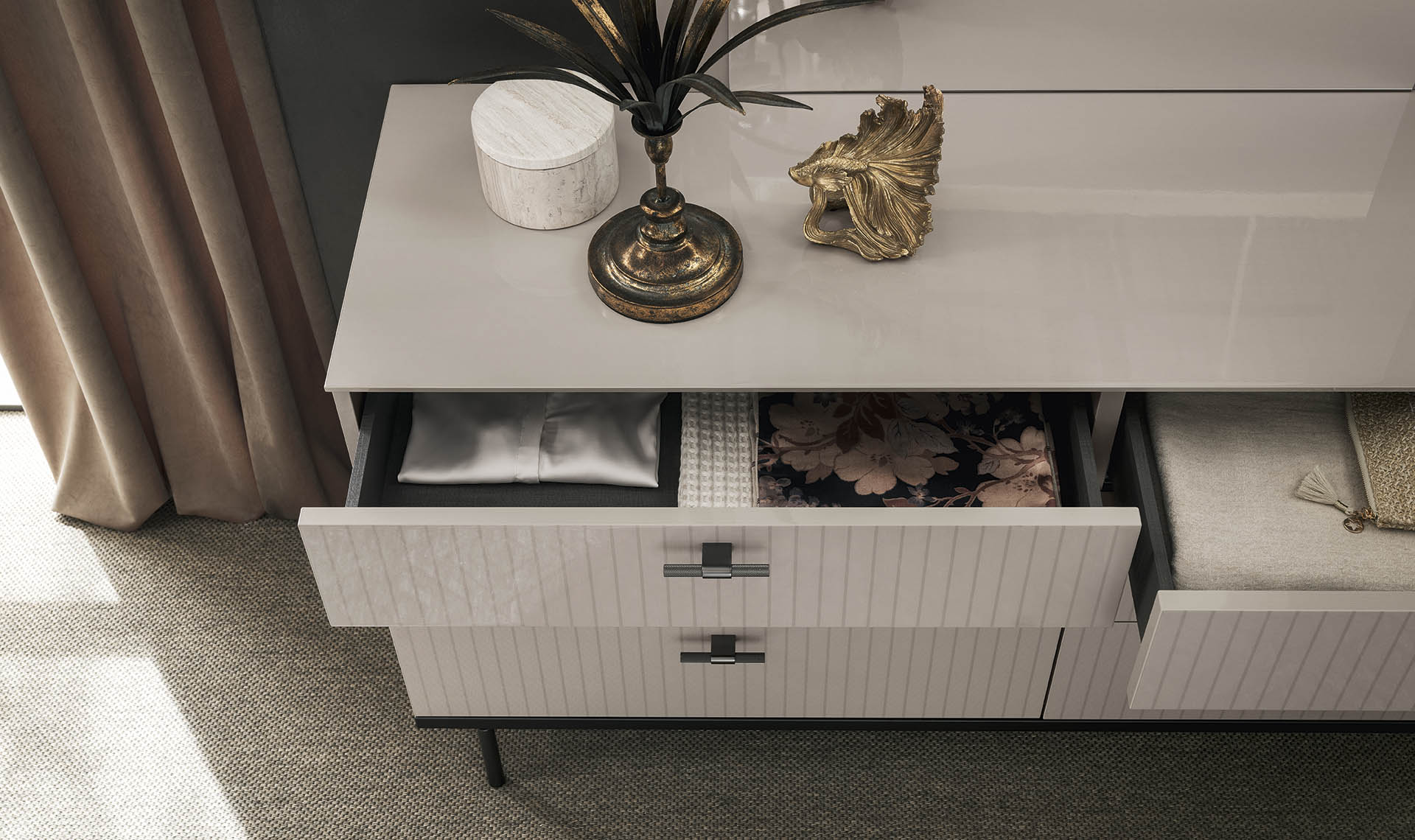 AL. Claire olasz dizájn hálószoba komód kétféle változatban. Korszerű struktúrájával, letisztult vonalaival és nagy méretű praktikus tárolóhelyeivel elegáns berendezésű hálószobák kiváló darabja lehet. A modellhez számos további, stílusban hozzáillő termék is választható.