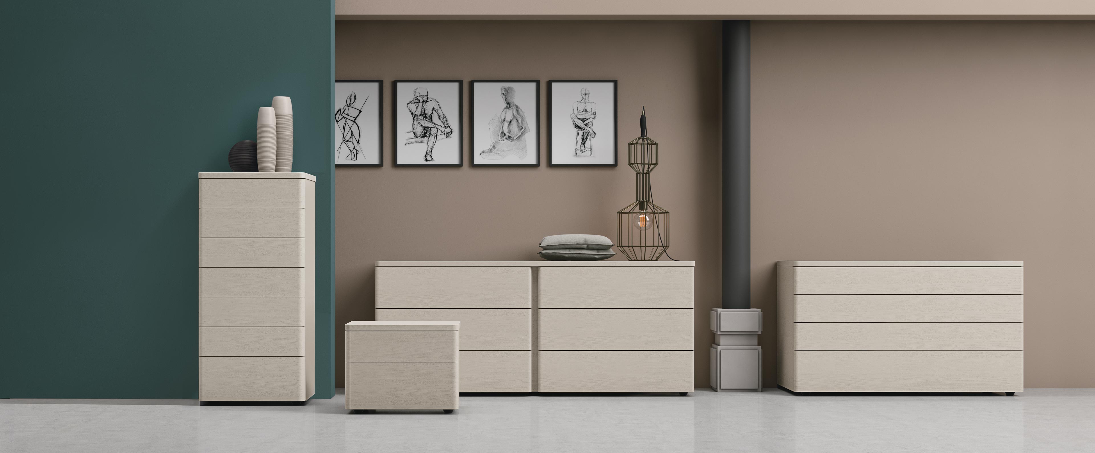 TMS. Dolcevita hálószoba komód és éjjeliszekrény különböző méretekben. Valamennyi változat tökéletes egyensúlyba hozza ívelt vonalait az egyébként határozott formavilágukkal. Sokféle színben és borítással kapható, hogy biztosan kiemelkedő esztétikus darabja lehessen hálószobájának.