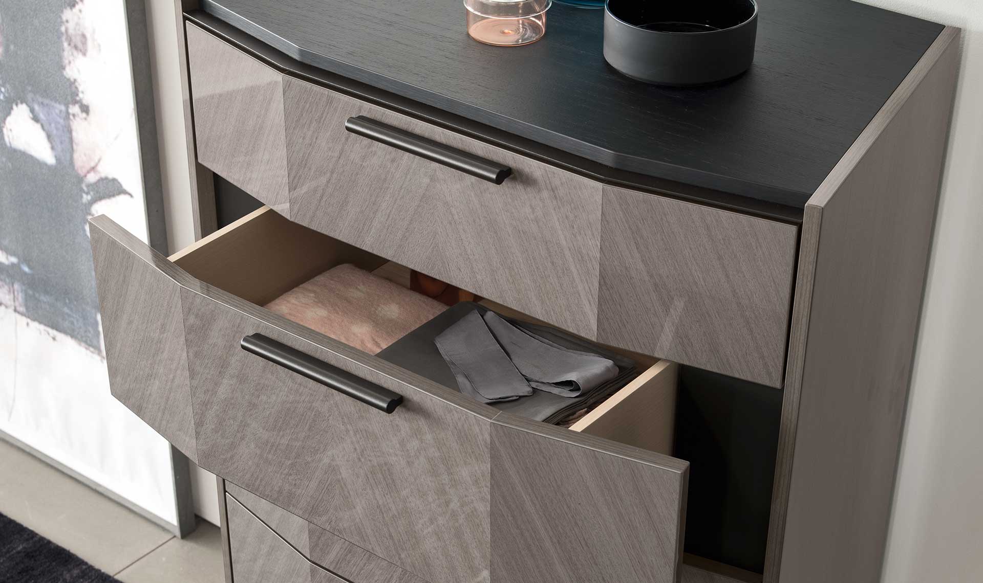 AL. OLI olasz dizájn komód kétféle változatban hat ill öt fiókkal. Az OLI hálószoba kollekció része, melynek kifinomult és praktikus kínálatával könnyedén és igényesen felszerelhetők a hálóhelyiségek. Az eukaliptusz fából készült komód további esztétikus és nagy méretű tárolóhelyekkel bővítheti otthonát.