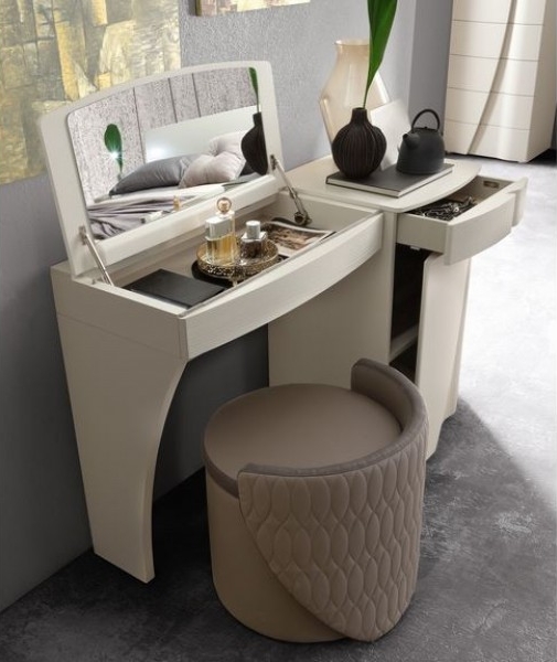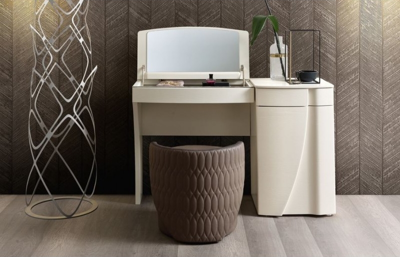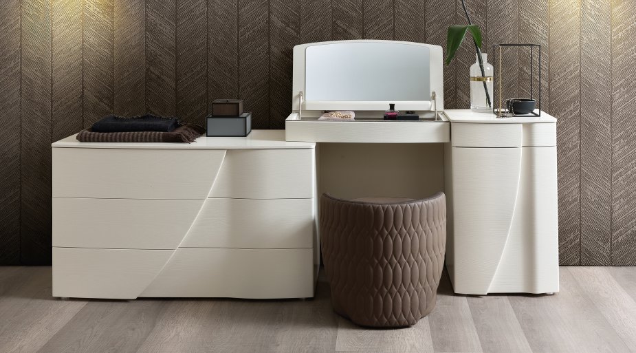 Camel Luna fehér kőris fésülködőasztal többféle változatban. Praktikus felépítésű olasz pipereasztal nagy méretű elegáns tárolófiókokkal. Az asztal fiókos részét a Camel Luna valamelyik komódja alkotja. Letisztult és esztétikus megjelenésével a hálóhelyiségek atmoszféráját garantáltan egyedivé varázsolja.