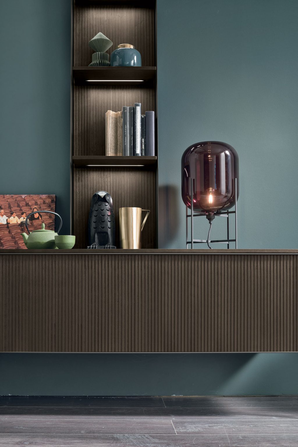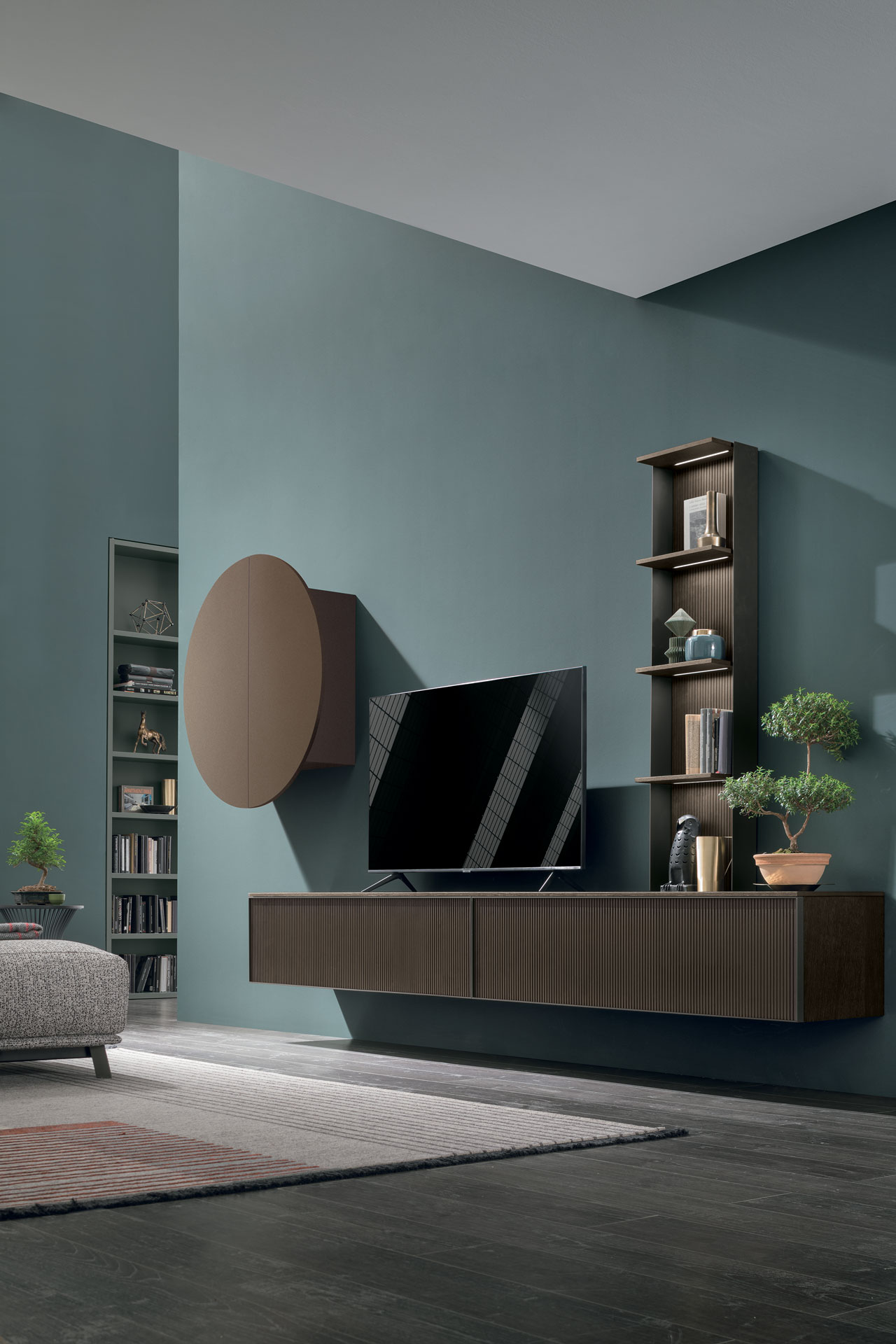 TMS. A108 elegáns olasz dizájn nappali összeállítás. Légies megjelenésű eredeti polcrendszer, mely magára vonja bármely helyiségben a tekintet. Különböző textúrájú felületekkel kapható.