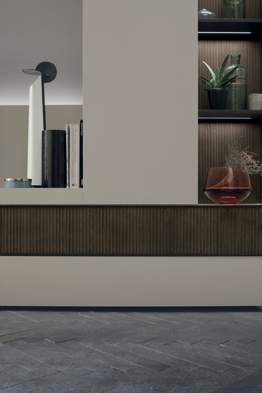 TMS. A110 elegáns olasz dizájn nappali összeállítás. A különböző textúrájú felületei izgalmas kompozícióba állnak össze szinte bármilyen nappali helyiségben, meghatározó stílusos darab válhat belőle.