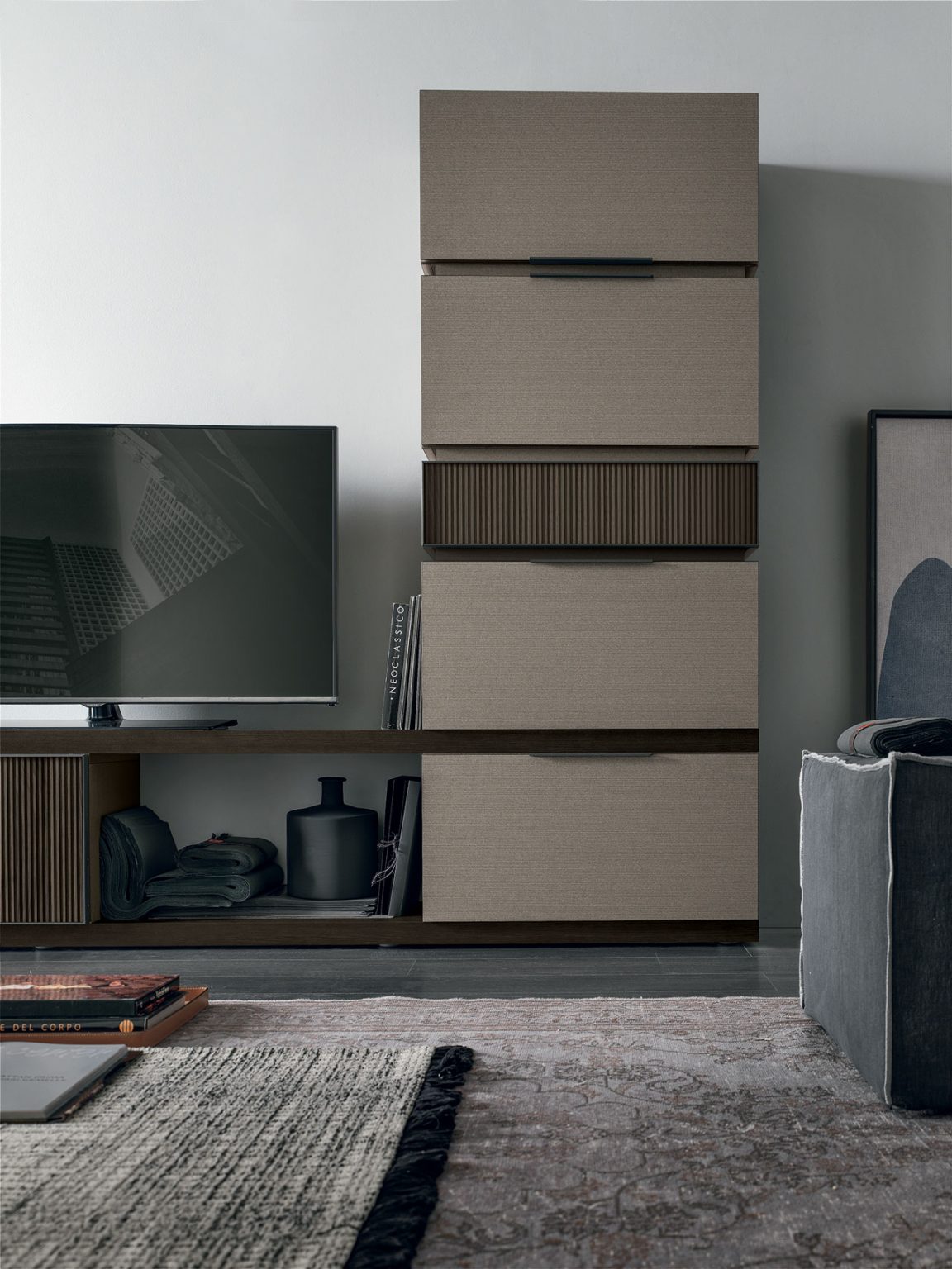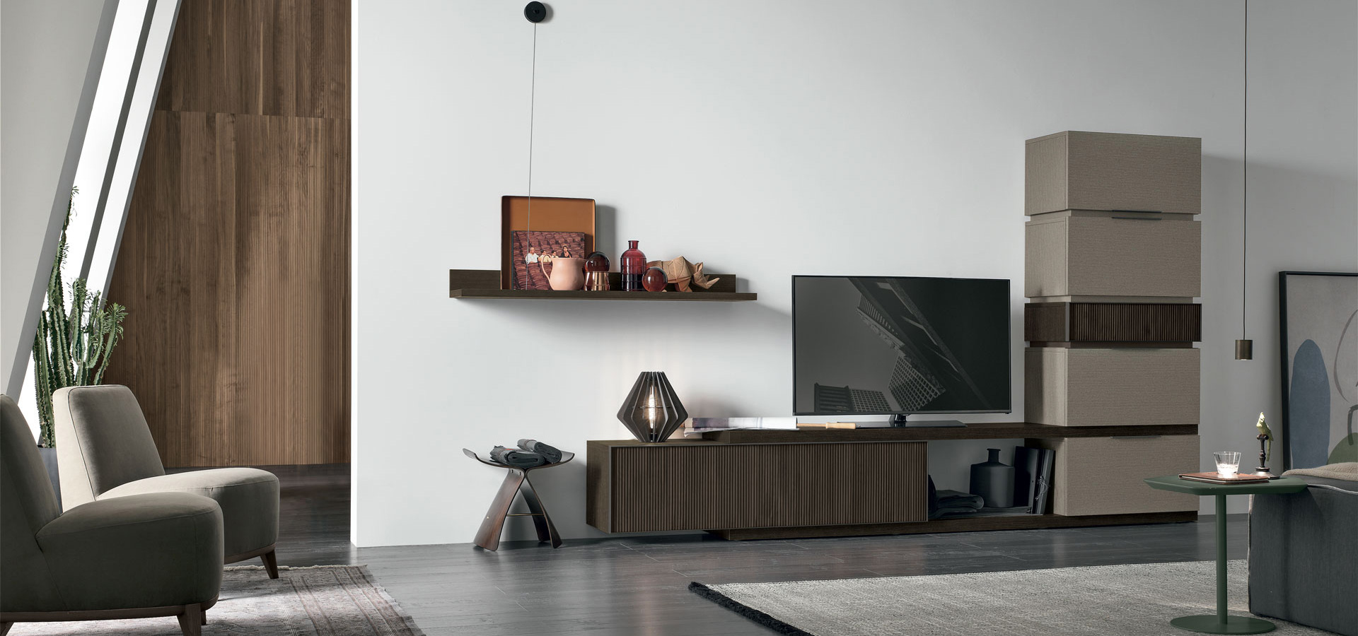 TMS. A111 elegáns olasz dizájn nappali összeállítás. Földön álló és falra akasztható egységekkel is rendelkezik ez a modern polcrendszer. Különböző textúrájú felületekkel kapható.
