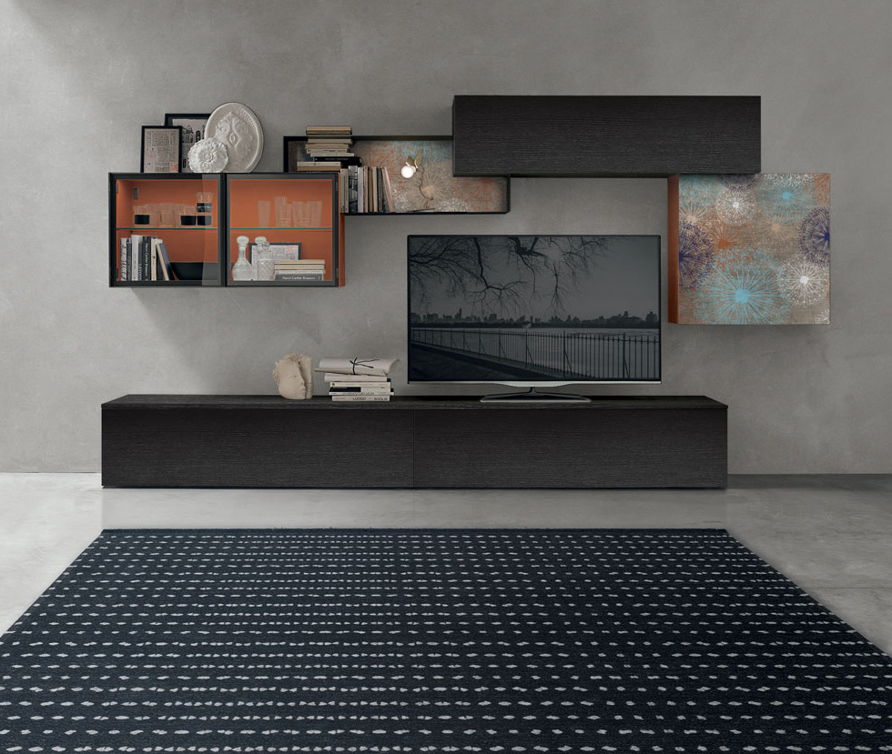 TMS. A139+ elegáns olasz dizájn nappali összeállítás. Légies megjelenésű eredeti polcrendszer, mely magára vonja bármely helyiségben a tekintet. A különböző textúrájú felületei izgalmas kompozícióba állnak össze szinte bármilyen nappali helyiségben.