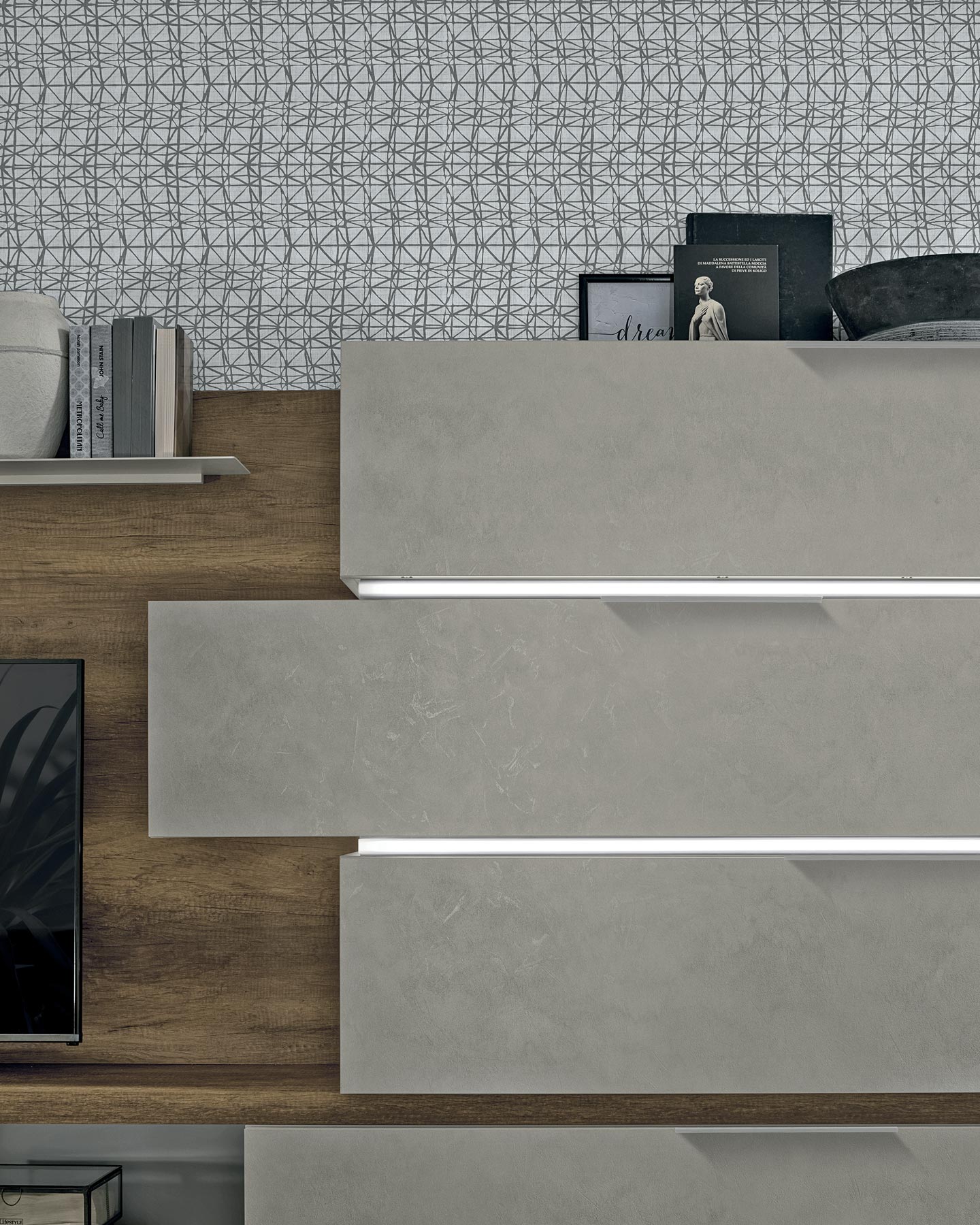 TMS. S005 elegáns olasz dizájn nappali összeállítás. A szekrény modulok egymásra helyezhető különböző elrendezésekben. közöttük LED-es világító elem található, mely kimagaslóan esztétikussá teszi a minimalista modern formatervezésű polcrendszert. Különböző textúrájú felületekkel kapható.