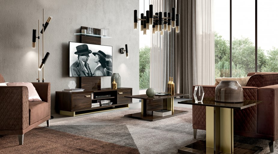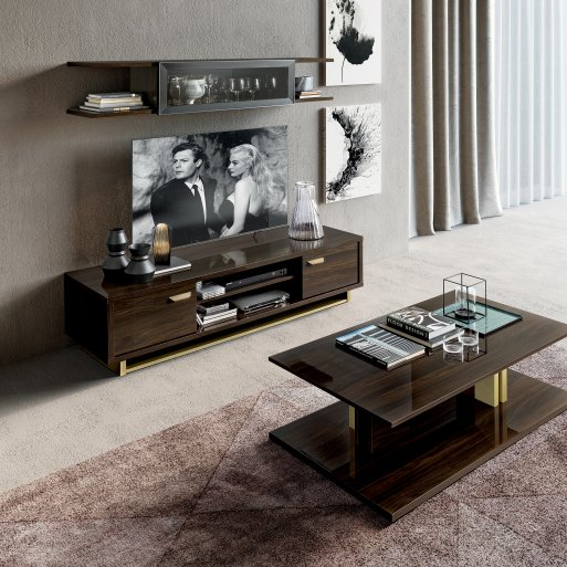 Cam. Volare olasz dizájn TV-állvány. Modern stílusával, fényes diófából készült felületeivel és lenyűgöző minimalizmusával nappalihelyiségek mutatós darabja lehet. Praktikus tárolóhelyeivel hozzájárul a zökkenőmentes kikapcsolódás és szórakozás biztosításához.