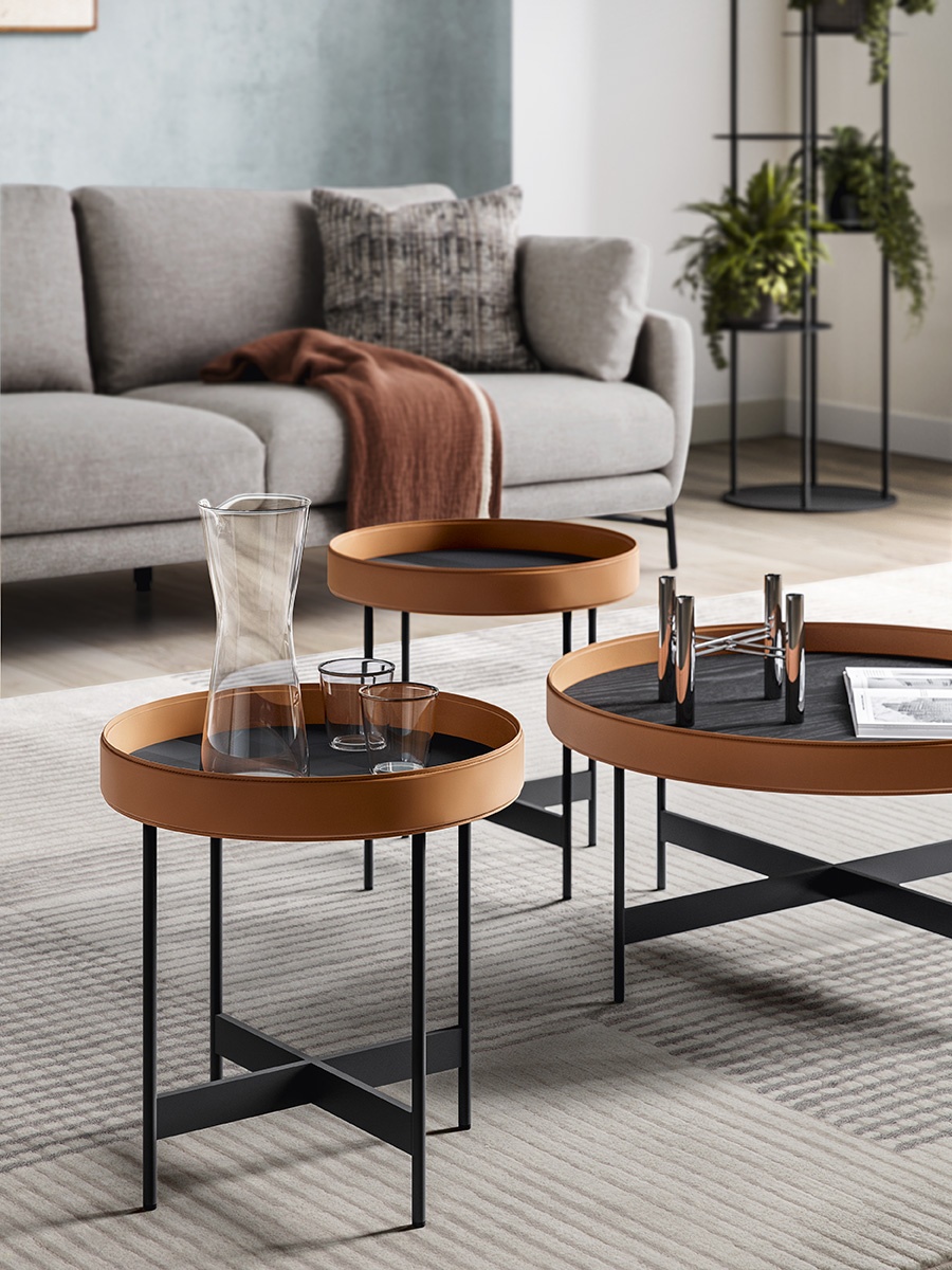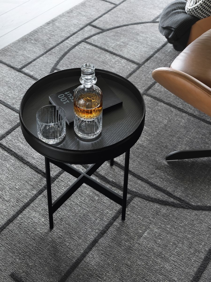 Az Arena kerek asztallapja matt, egyszínű felületű fából készül, melyet elegánsan ölel körbe a konyak árnyalatú, regenerált bőrből készült perem. Ez a részlet adja a modell különleges karakterét – egy finoman divatinspirált megoldás, amely keretet és védettséget sugall, mintha egy kis „személyes zóna” lenne a mindennapok közepén. A matt fekete fém váz stabilitást és vizuális könnyedséget kölcsönöz az asztalnak, kiemelve a Calligarisra jellemző prémium megmunkálást.