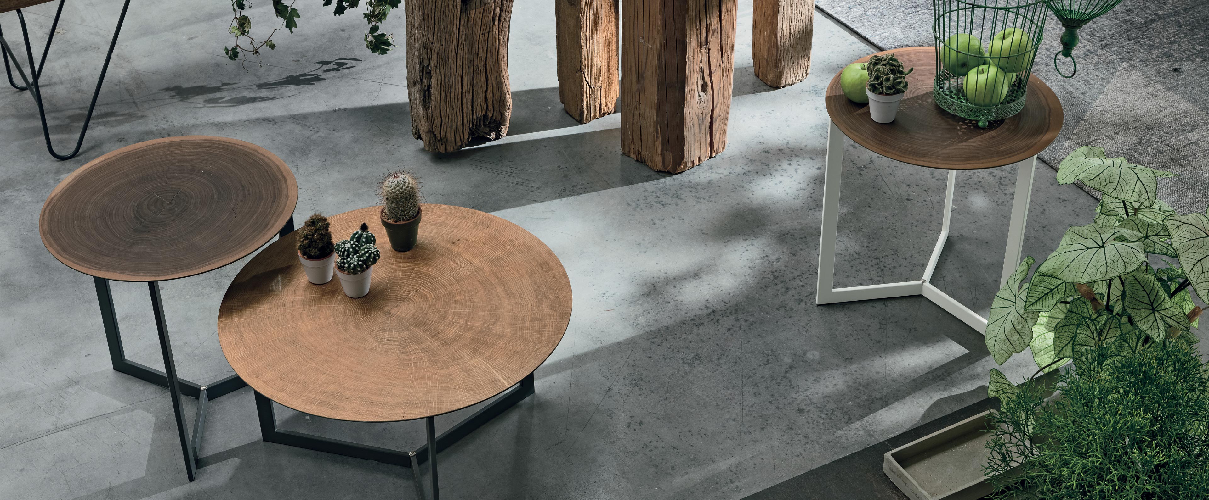 TMS. Joy Wood kör alakú dohányzóasztal kétféle méretben. Elegáns olasz dizájn kávézóasztal fém vázszerkezettel és fából készült asztallapjának köszönhető természethű megjelenéssel. Ideális nappalik, kültéri, vagy közéleti helyek felszereléséére.
