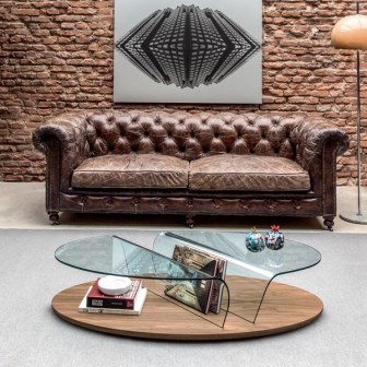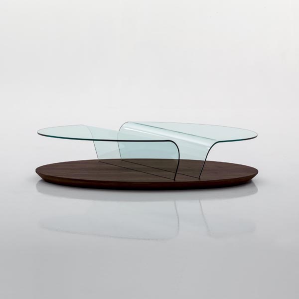 Tonin Casa Arona dohányzóasztal. Olasz modern dizájn dohányzóasztal fa lábbal és két, szárnyat idéző üveg asztallappal, közöttük újságtartóval. A modellhez számos további stílusban hozzáillő termék is választható.